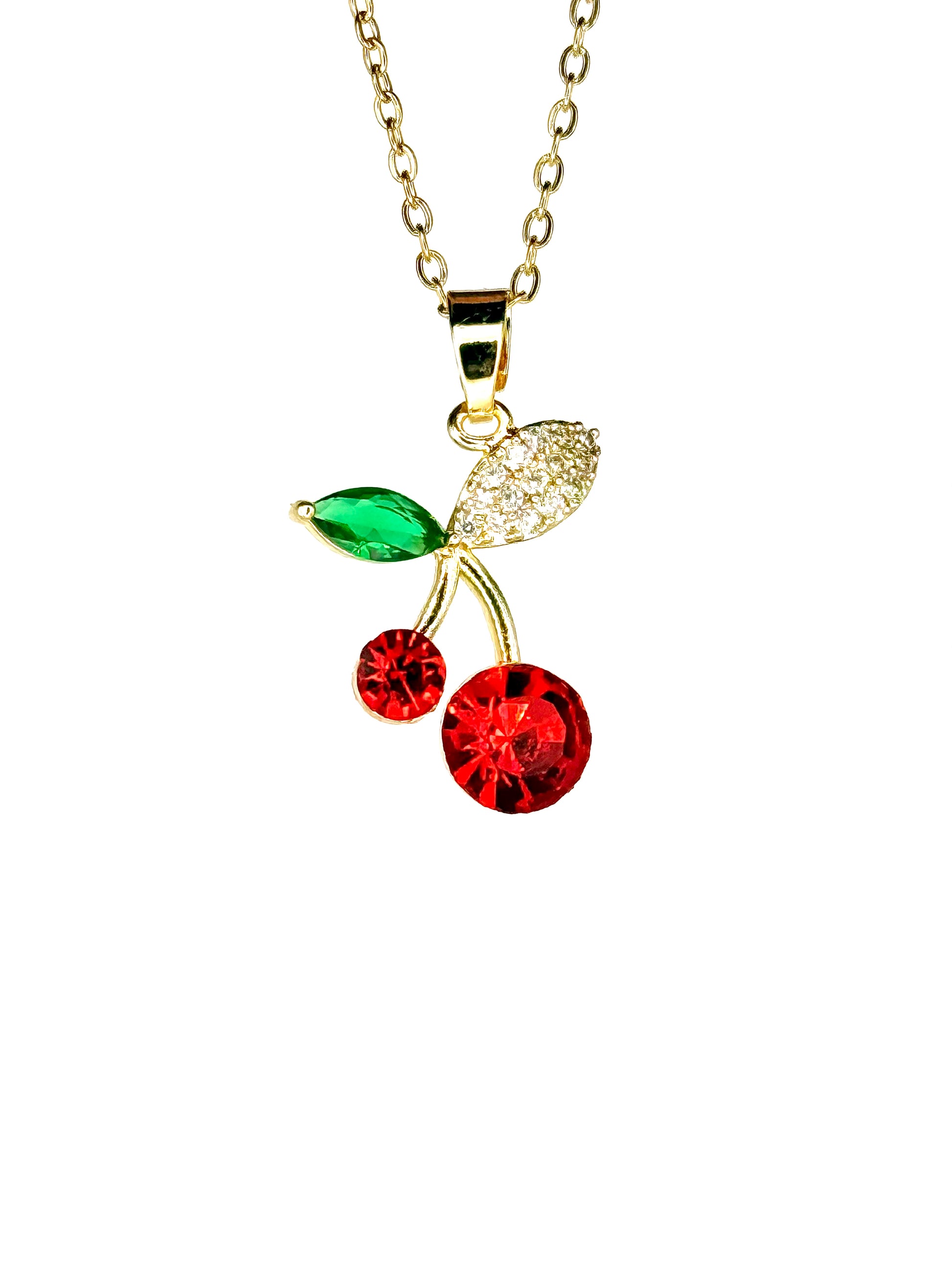 Collier Cherry Rouge à Pétales Vertes & Dorées avec Strass
