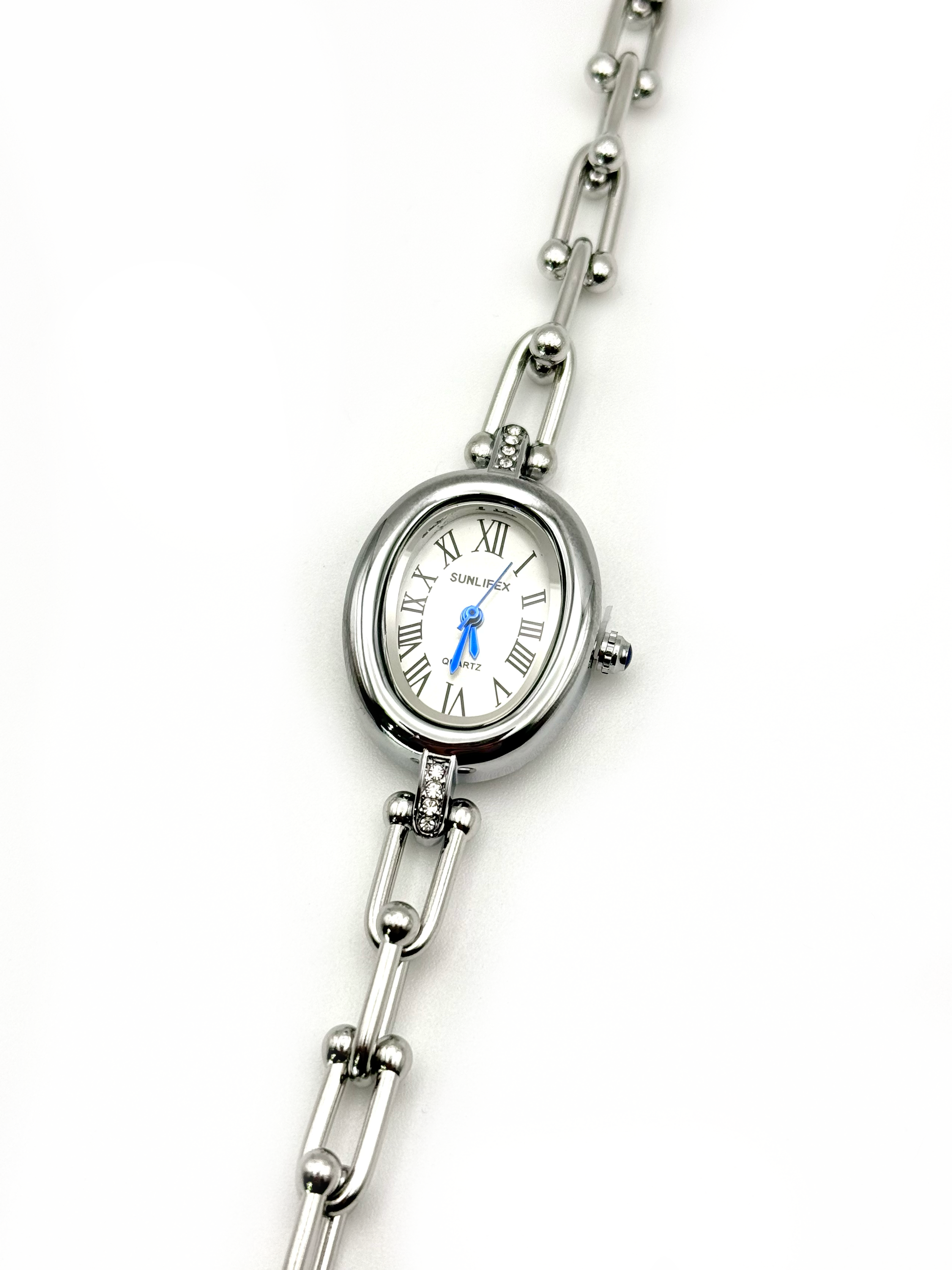 Découvrez l'élégance intemporelle de la montre Mina argentée. Confectionnée en acier inoxydable résistant, elle allie durabilité et raffinement. Son bracelet en chaîne inspirée épouse délicatement votre poignet, tandis que les chiffres romains gravés sur le cadran ajoutent une touche de sophistication classique. Parfaite pour sublimer vos tenues quotidiennes ou vos occasions spéciales, cette montre est le compagnon idéal pour celles qui apprécient le style intemporel et la qualité.