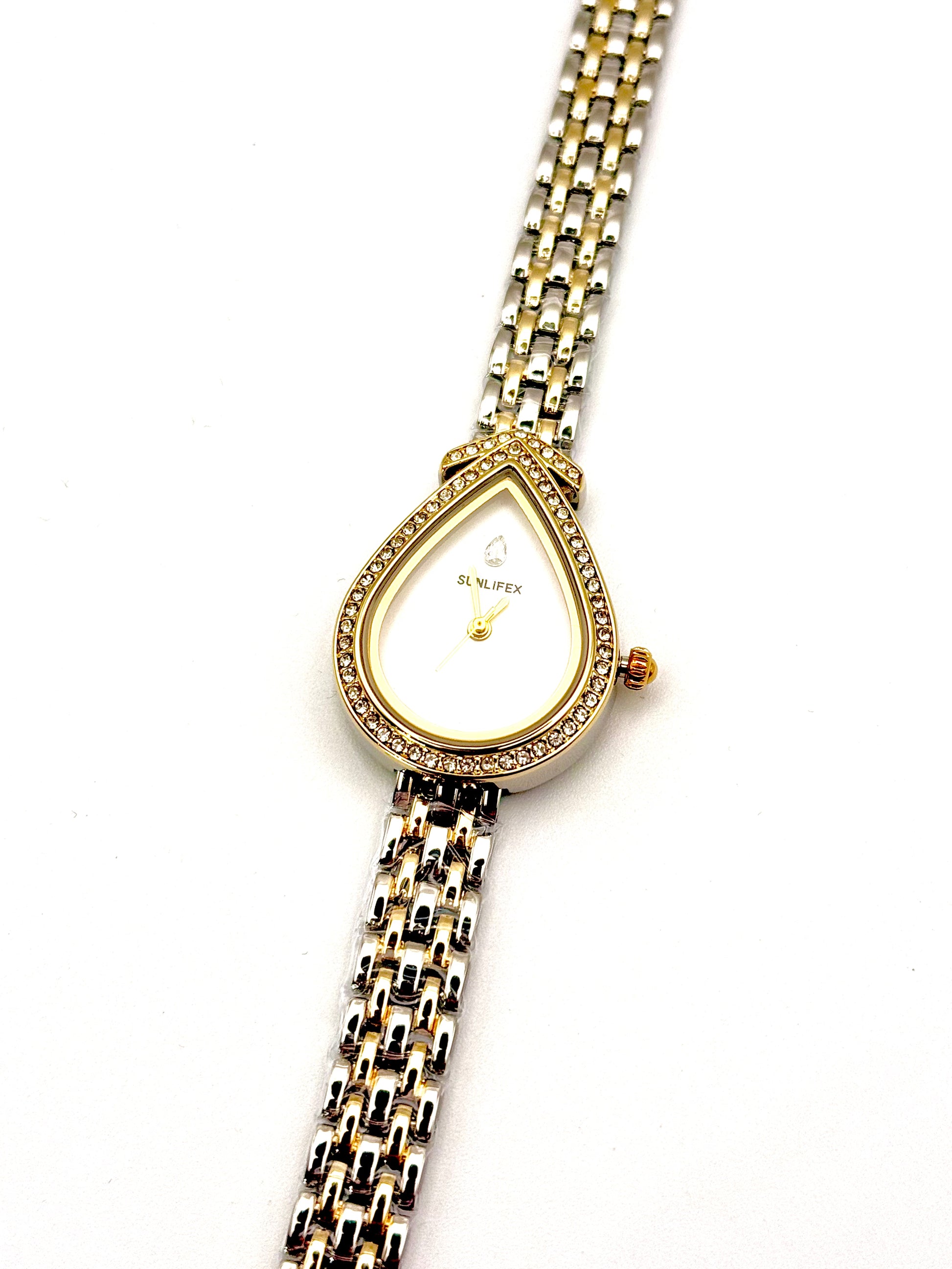 Découvrez Raya bicolore, une montre qui redéfinit l'élégance minimaliste. Dotée d'un boîtier en acier inoxydable aux lignes épurées, elle arbore une silhouette distinctive en forme de goutte qui capture la lumière avec grâce. Son cadran dépouillé, sans chiffres ni traits, invite à une lecture intuitive du temps. Le bracelet bicolore apporte une touche de sophistication, tandis que le contour orné de strass scintillants ajoute une dimension luxueuse à ce design intemporel. Une pièce parfaite pour celles qui cherchent à exprimer leur style avec subtilité et raffinement.